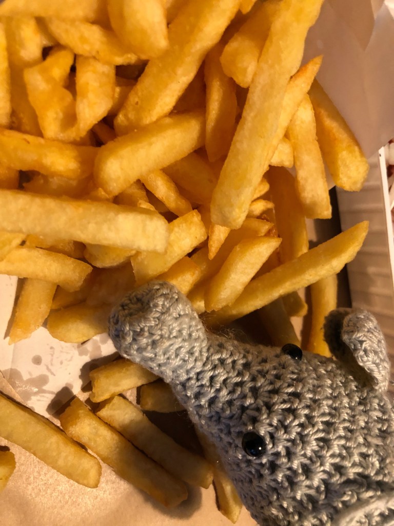 Zurück zu meinen Freunden nebenan. Es war Abend geworden, langsam wurde es dunkel, Ruhe kehrte nicht ein. Wir saßen draußen, Nachbarn verabschiedeten sich um zu duschen. Ok viel Spaß, wir würden uns der Nahrungsaufnahme widmen. Es gab sogar Pommes !!! Auf dem Platz zum mitnehmen an den Nistkasten, das gefiel mir.